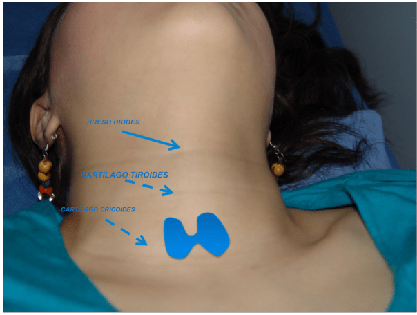 Figura 1. Anatomía de superficie: proyección anatómica de la glándula tiroides en su posición definitiva. Se señalan con flecha sitios de referencia importantes.