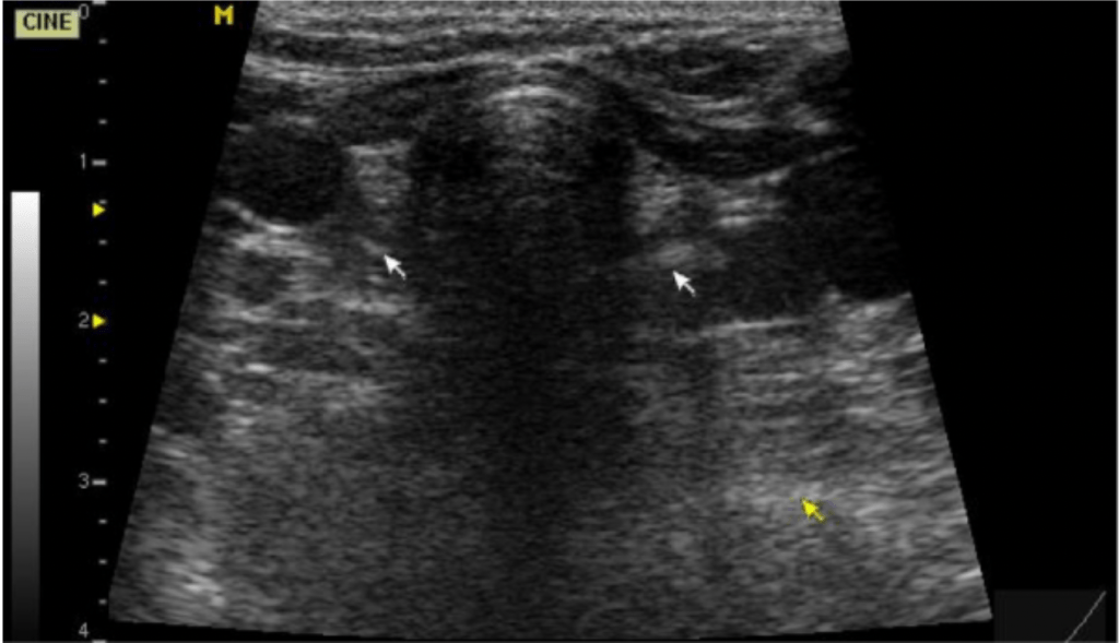 Figura 2. Ausencia de glándula tiroides en el área de su localización usual. Se señala con flechas blancas el sitio donde debería estar (comparar con figura 5 que muestra una tiroides normal).