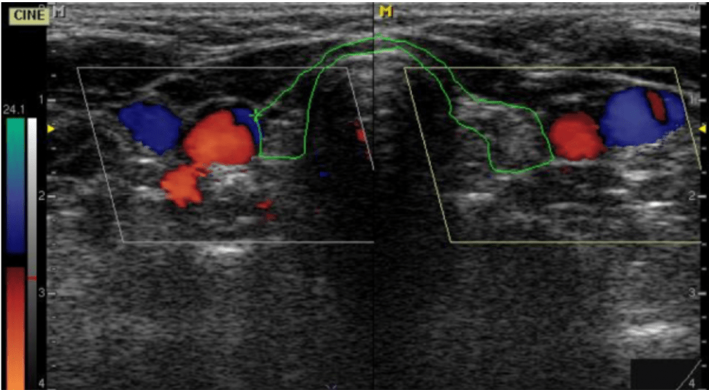 Figura 3. Ecografía Doppler, para ver circulación tiroidea. En rojo se observan las arterias carótidas derecha e izquierda, en azul las venas yugulares y hay ausencia de circulación en el área que correspondería a la glándula tiroides.