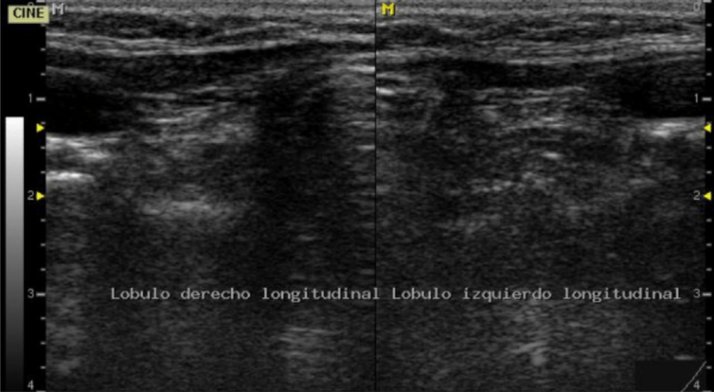 Figura 4. Vista longitudinal en área de territorio tiroideo que no muestra lóbulos tiroideos donde deberían estar. Comparar con figura 6 que muestra lóbulos tiroideos normales.
