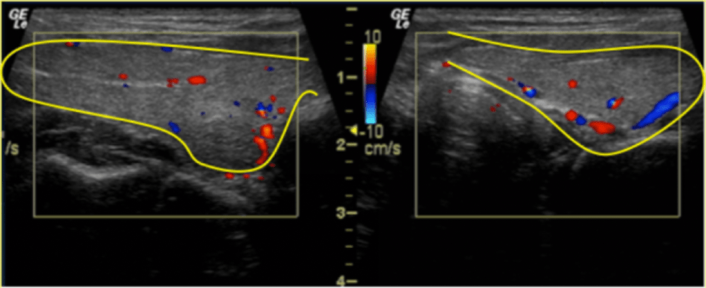 Figura 6. Vista longitudinal que muestra ambos lóbulos tiroideos normales. Técnica de Ecografía con Doppler observándose arterias y venas normales.