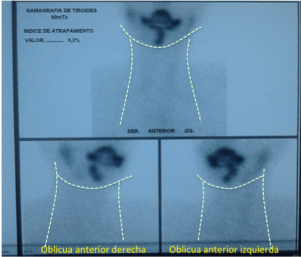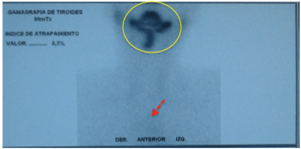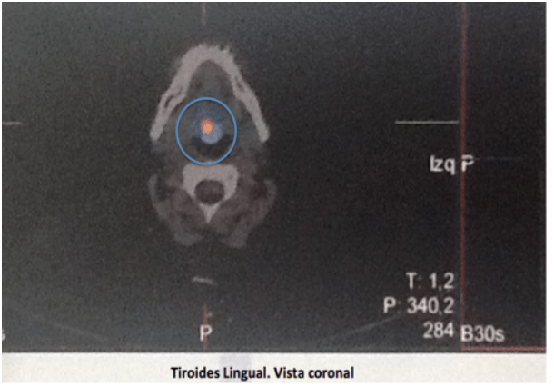 Para localizar la tiroides se solicita Gamagrafía de Tiroides, realizada en Cali, Colombia, en el departamento de Medicina Nuclear, en la Fundación Valle del Lili, por la Doctora Luz Maritza Pabón, especialista en Medicina Nuclear, cuyo resultado confirma TIROIDES ECTÓPICA DE LOCALIZACIÓN LINGUAL